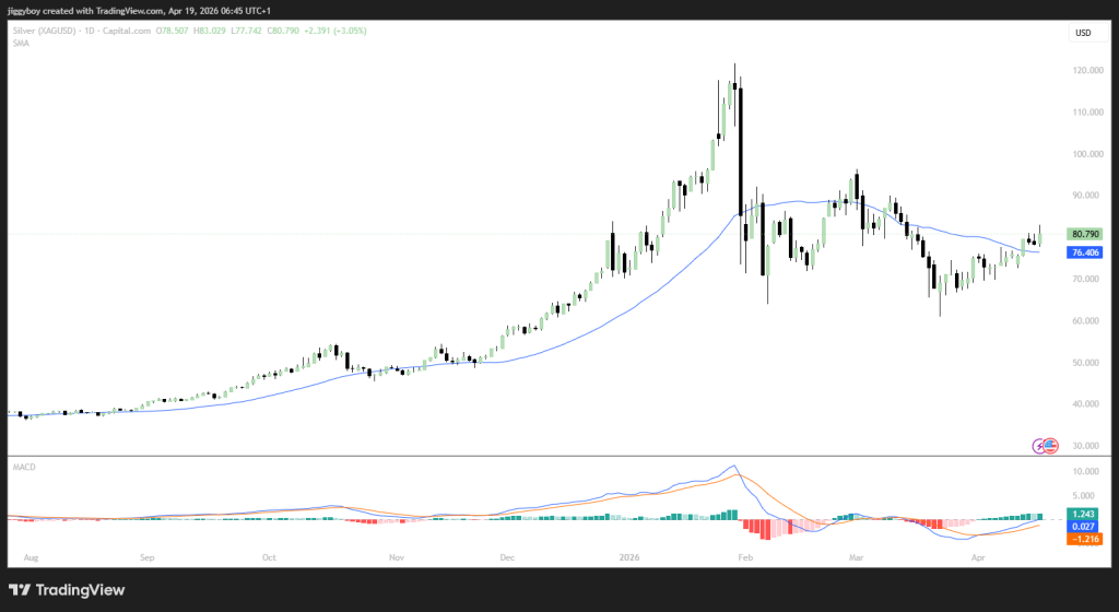 The Silver price has been moving in a tense range lately. After nearly breaking below $75 earlier in April, it has pushed back up and is now holding around $78 to $82.