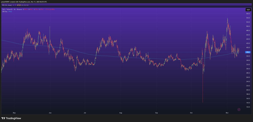 On the resistance side, the key zone remains the $450–$500 region where TAO repeatedly faced rejection. This is the level price needs to reclaim for momentum to turn fully bullish into the halving window. A clean break above that zone could open a path back toward the $530–$560 levels – especially if speculation begins building rapidly.