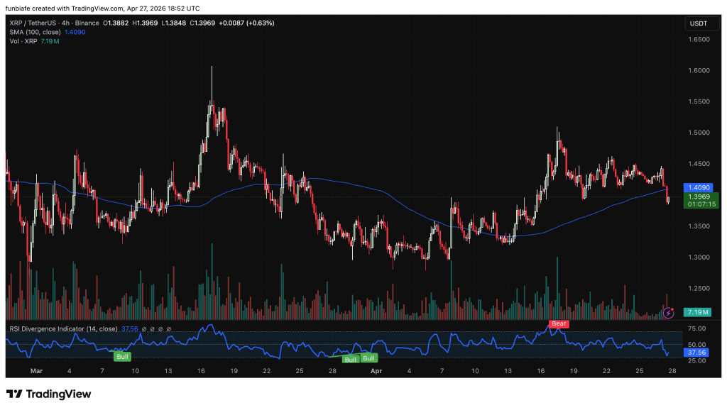 At the moment, the XRP price is around $1.39, and there’s been a slow push higher from recent lows. Volume isn’t dead, but it’s not strong either. That usually means traders are involved, just not fully committed yet. It’s the kind of setup where things can stay slow until a key level gets taken out.