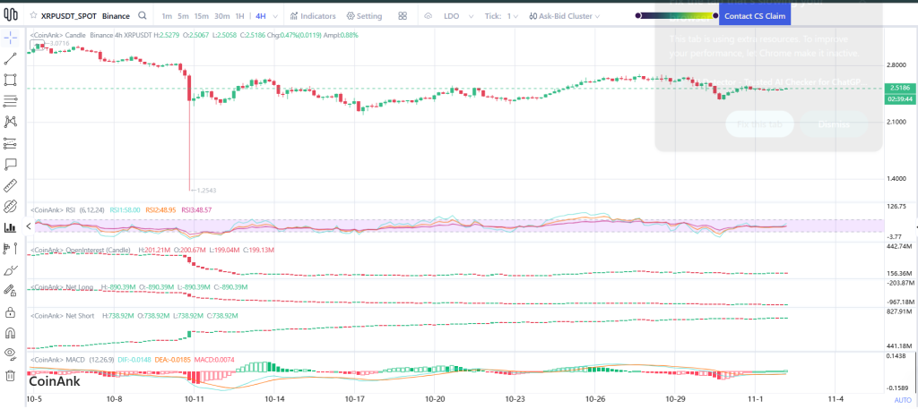Ripple’s XRP price trades around $2.51 and remains under clear selling pressure after the late-October breakdown. A sharp wick down to $1.25 showed how quickly liquidity can vanish in risk-off moments.