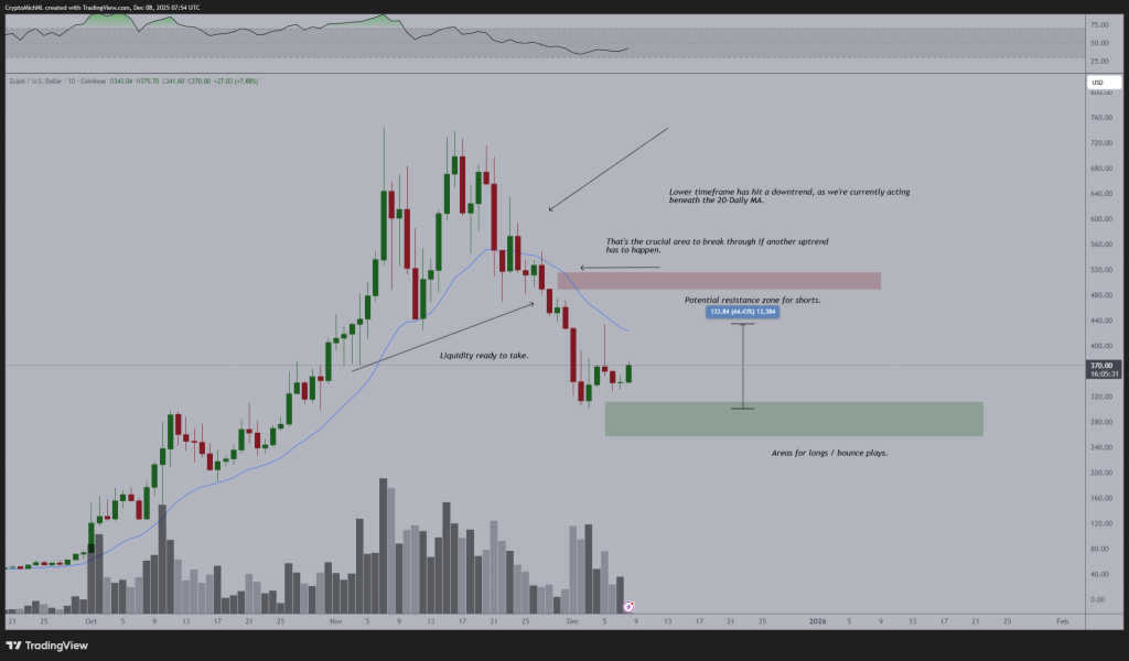 The daily timeframe also shows the ZEC price sitting below the 20-day moving average, which means the short-term trend hasn’t fully flipped yet.