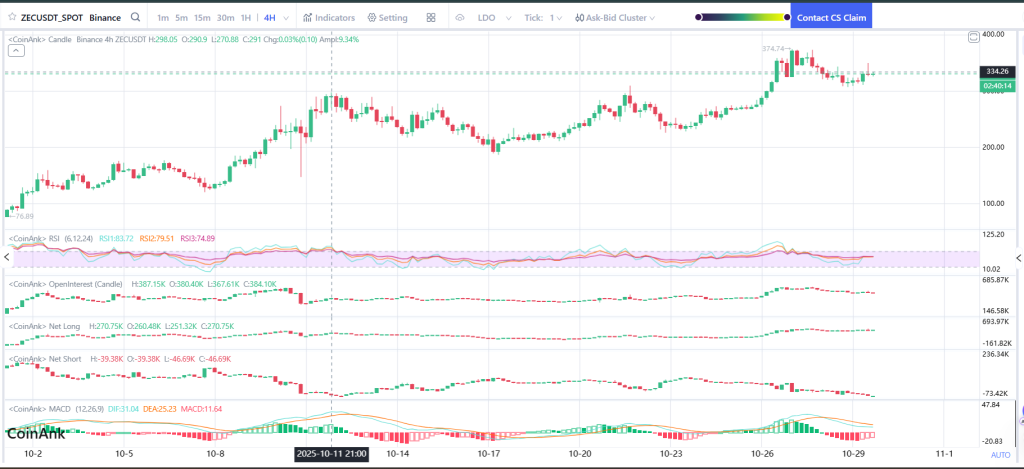 The 4H chart paints a story of consolidation after an explosive breakout. ZEC price printed a strong upward channel through late October, reaching a local high around $374 before cooling off. It’s retesting the breakout level, above and beyond $320 support.