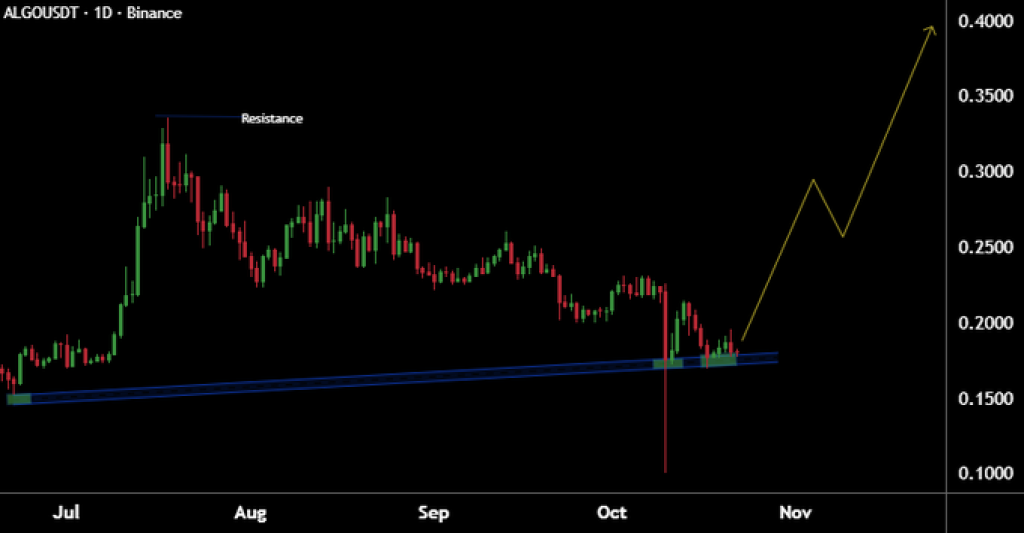 Right now, ALGO is hovering just above the $0.17–$0.18 zone, a level that’s served as strong support multiple times in recent months. The structure looks clean: higher lows forming, trendline intact, and volume slowly creeping back in.