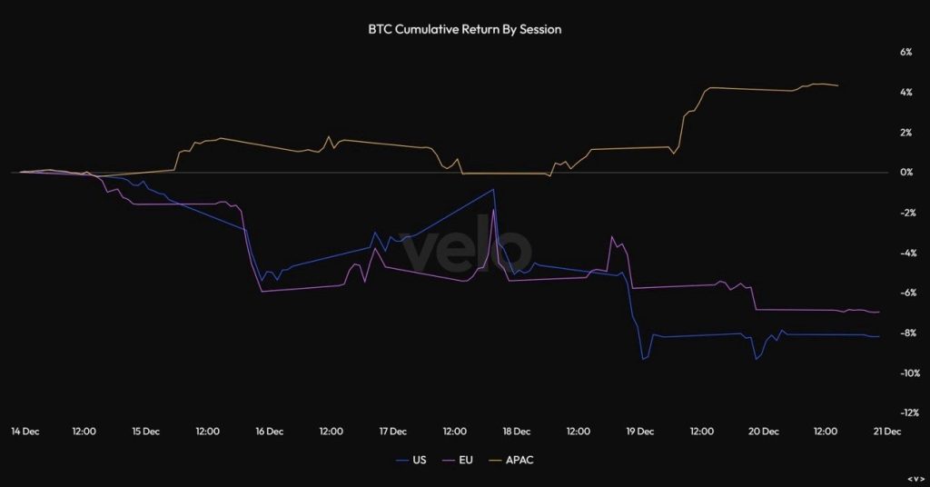 During U.S. trading hours, shown in blue on the chart, Bitcoin has been bleeding lower almost consistently. Losses tend to build throughout the session, making the U.S. market the main source of downside pressure. The European session, shown in purple, follows a similar path, though the selling there appears more gradual.