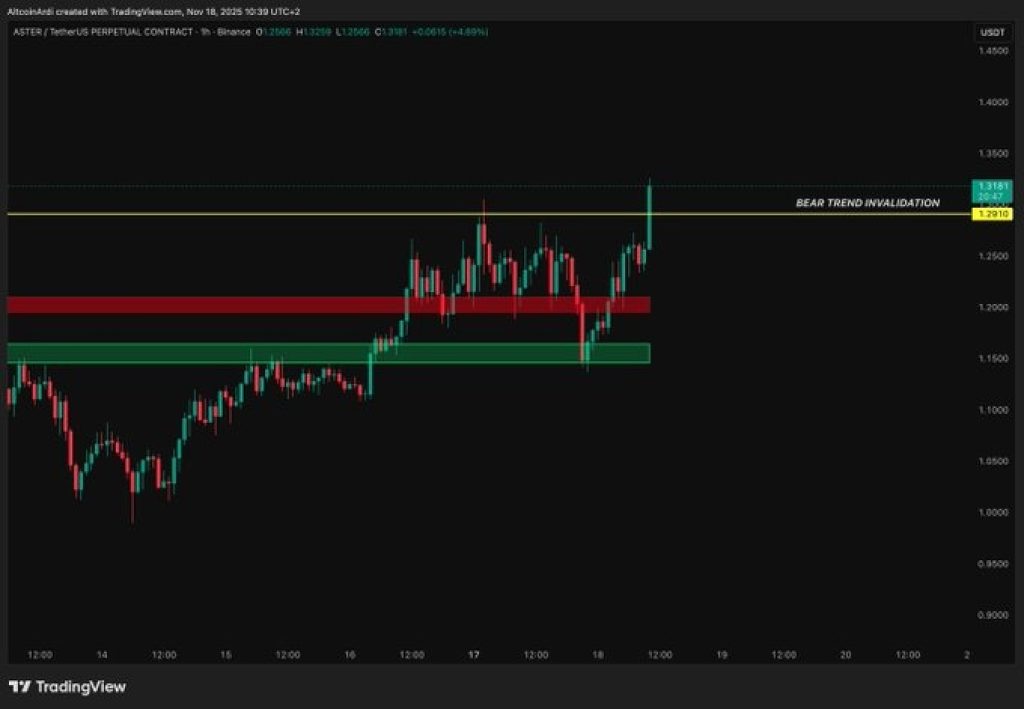 The technical picture is just as important. Analyst Ardi highlighted the key breakout level at $1.29, calling it the “bear trend invalidation” zone. After days of consolidating underneath it, the ASTER price finally blasted through the level, and the breakout came with strong momentum.