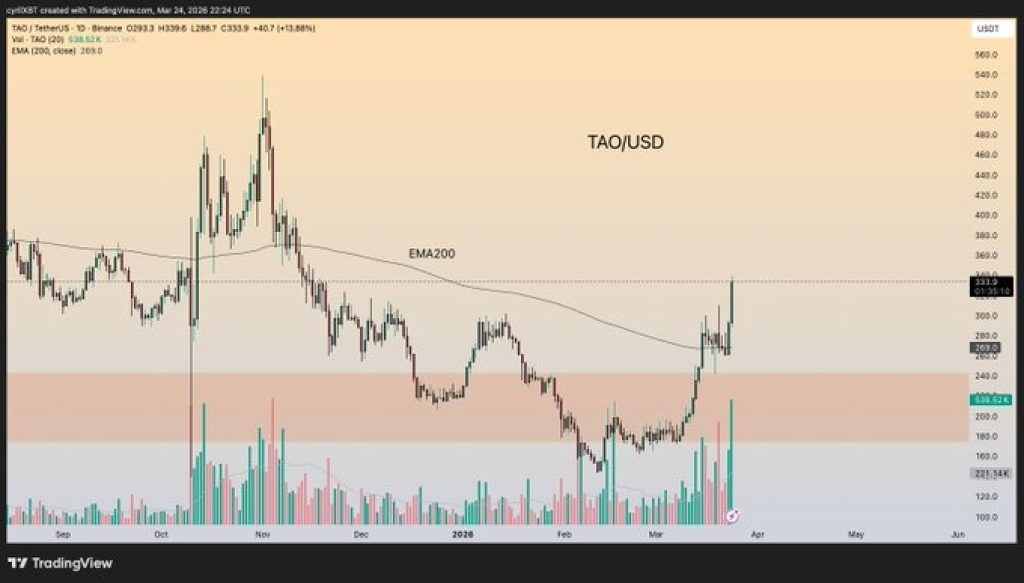 From a technical standpoint, the move looks clean. The TAO price recently broke above its 200-day EMA around $269, a key level traders watch closely. It also printed a strong daily candle with massive volume, the highest seen in months.