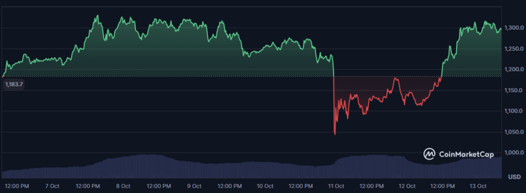 While most altcoins are still trying to recover from the recent market bloodbath, the BNB price is once again pumping. The token has jumped more than 13% in the past 24 hours, reclaiming levels above $1,250, and becoming one of the top gainers across the entire crypto market.