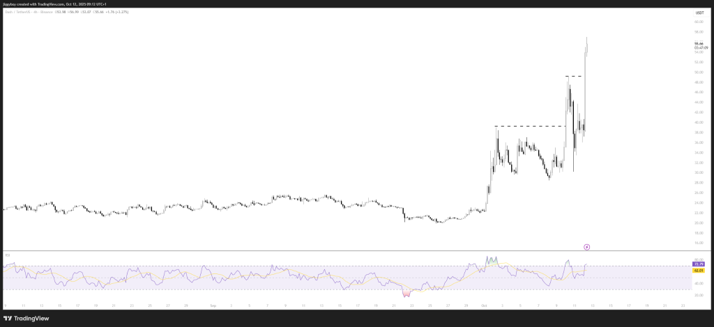 Dash is doing what most altcoins can’t right now, ignoring the chaos. While the broader market is still licking its wounds after the crash two days ago, DASH price is up nearly 40%, trading around $53.04. That makes it the top gainer in the market today and one of the few coins breaking new highs instead of breaking down.
