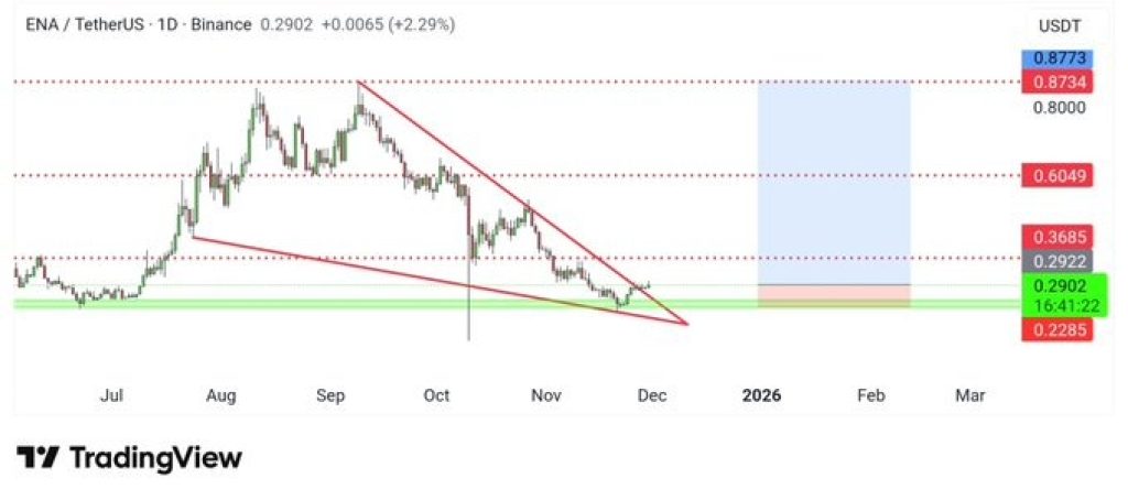 Now the ENA price is hovering around $0.29, sitting right at the wedge breakout line. If ENA manages to close above this level with strong volume, the entire structure flips bullish for the first time in months.