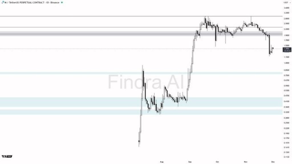 The daily chart shared by Finora shows the M price sitting right above an important demand zone near $1.3810.
