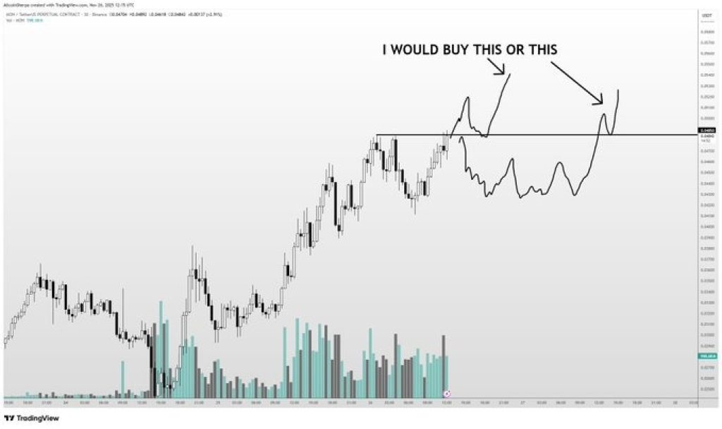 He’s waiting for either a clean breakout above this level or a steady consolidation pattern. Jumping in too early doesn’t make sense here, because the MON price has been extremely volatile. A solid breakout would give traders much more confidence.