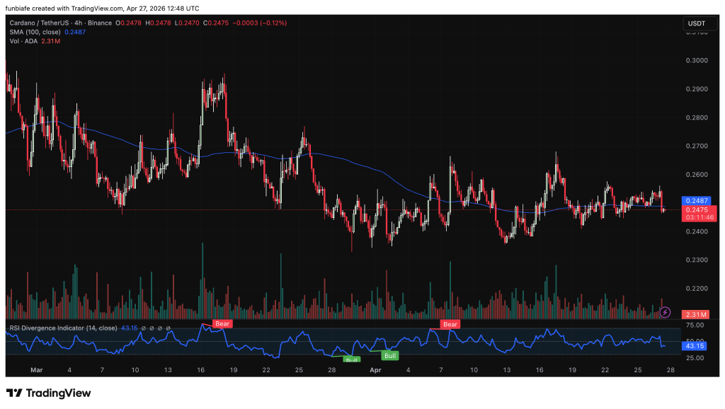 Overall, RSI near 43 and low volume suggest weak momentum and a quiet market. ADA is coiling tightly, the next move will likely come soon once either $0.2487 or $0.2470 gives way.
