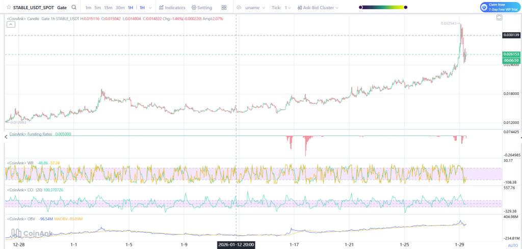 The STABLE price spiked toward the $0.03 area before pulling back slightly. The next level traders are sitting near $0.02927. On the downside, short-term support rests near $0.02424.