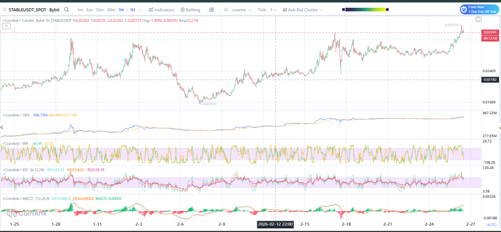 The STABLE price is moving because traders are piling in, and the volume confirms that. The cleanest tell from here is whether price can keep holding above the $0.032–$0.033 zone.