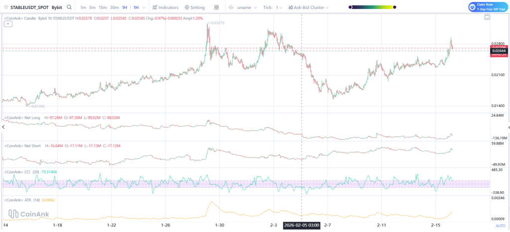 Looking at the 1H chart, the STABLE price has been in a steady uptrend since mid-January, climbing from the $0.014 zone into the $0.02 range before accelerating sharply in February.