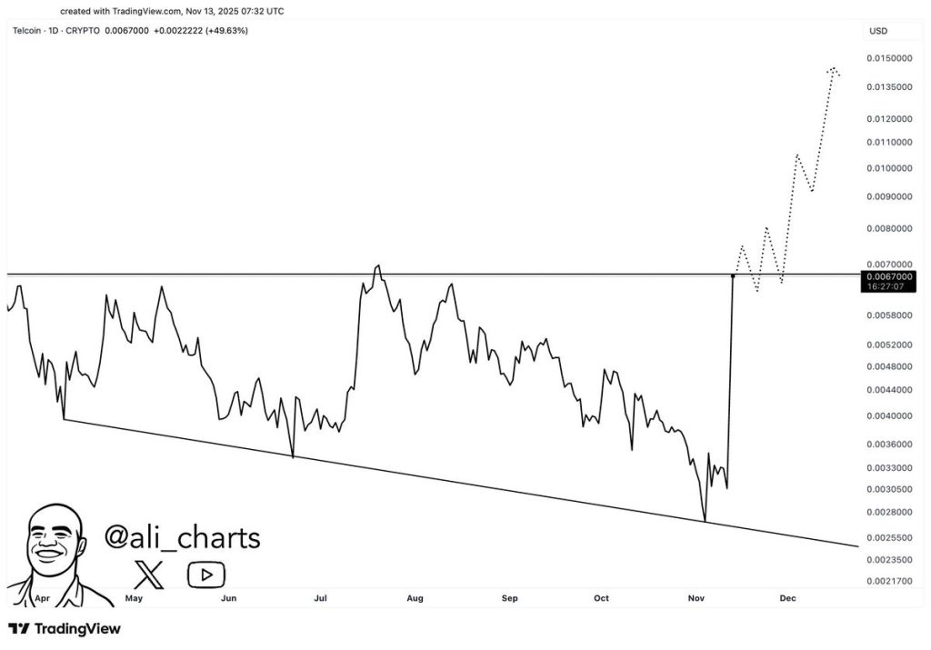 What makes this moment interesting is what happens next. If TEL manages to break above $0.0068 with real strength, Ali notes the next major target sits around $0.014.