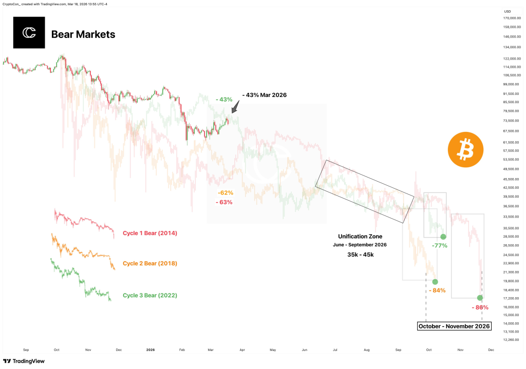 According to CryptoCon, the most likely next step is a decline to $45,000 and eventually $35,000. That’s where drawdowns from different cycles unify in a zone he calls the “Unification Zone” from June to September 2026.