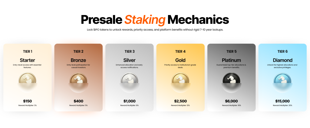 - Pre-IPO exposure, staking tiers, backed, $0.0001415 presale