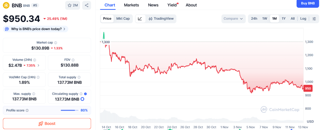 BNB continues to be a cornerstone of the crypto market. Trading around $950, it retains massive liquidity, a powerful ecosystem, and strong exchange backing. Its technical outlook shows: