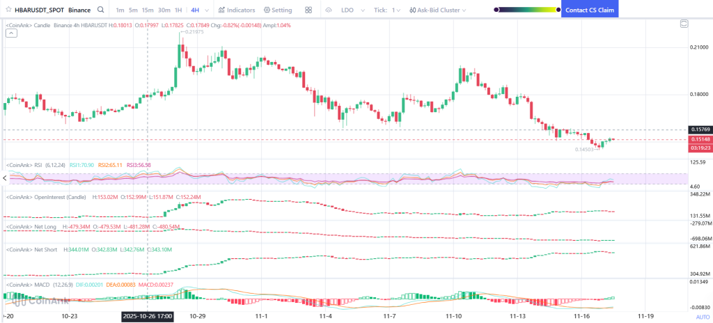 The chart shows that the HBAR price is still in a downtrend on the 4-hour timeframe, but the recent reaction at $0.145 was a positive sign.