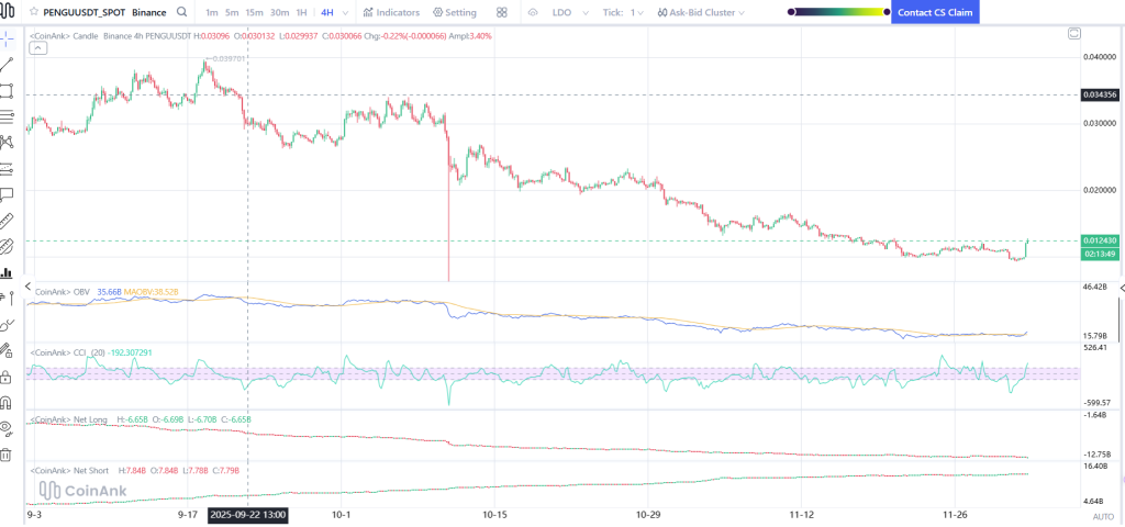 The selloff accelerated in mid-October and again in late November, sending the PENGU price into the $0.01 range.