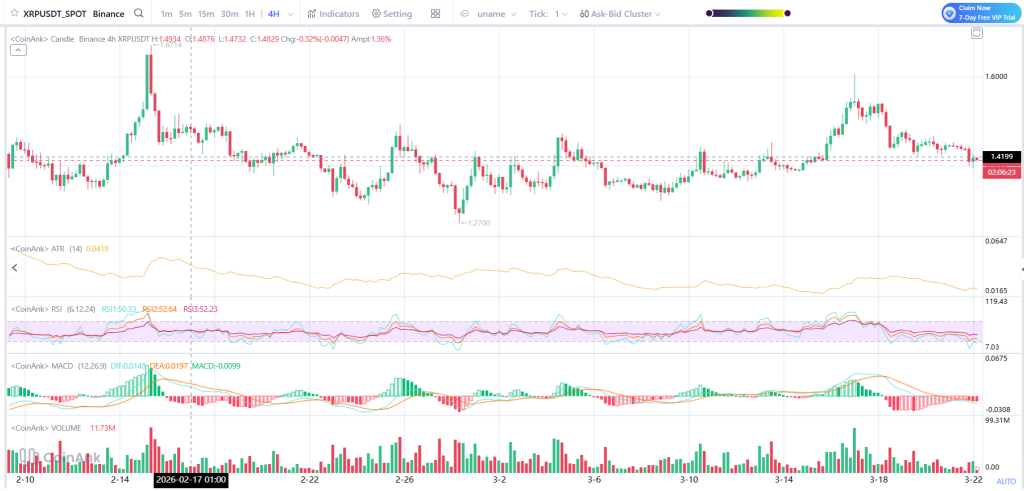 The XRP price is sitting around $1.41 right now, just under that resistance area, and you can see buyers are having a hard time pushing it back up.