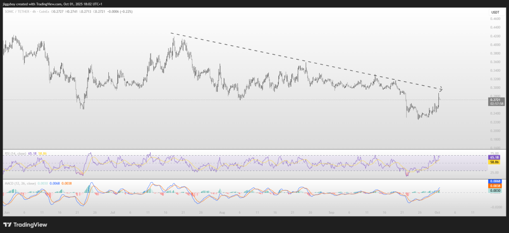 The 4H chart tells the story of a strong rebound. Sonic price bounced from the $0.24 zone and is now pushing up toward $0.27–$0.28.
