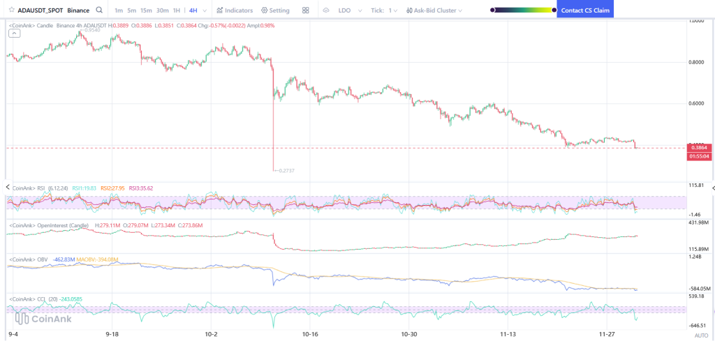 The 4-hour chart has been drifting lower since mid-November. ADA dropped from the $0.95 area earlier this year and has just kept slipping, making smaller highs and lower lows along the way. The sharp wick toward $0.27 last month shows how fragile liquidity has been.