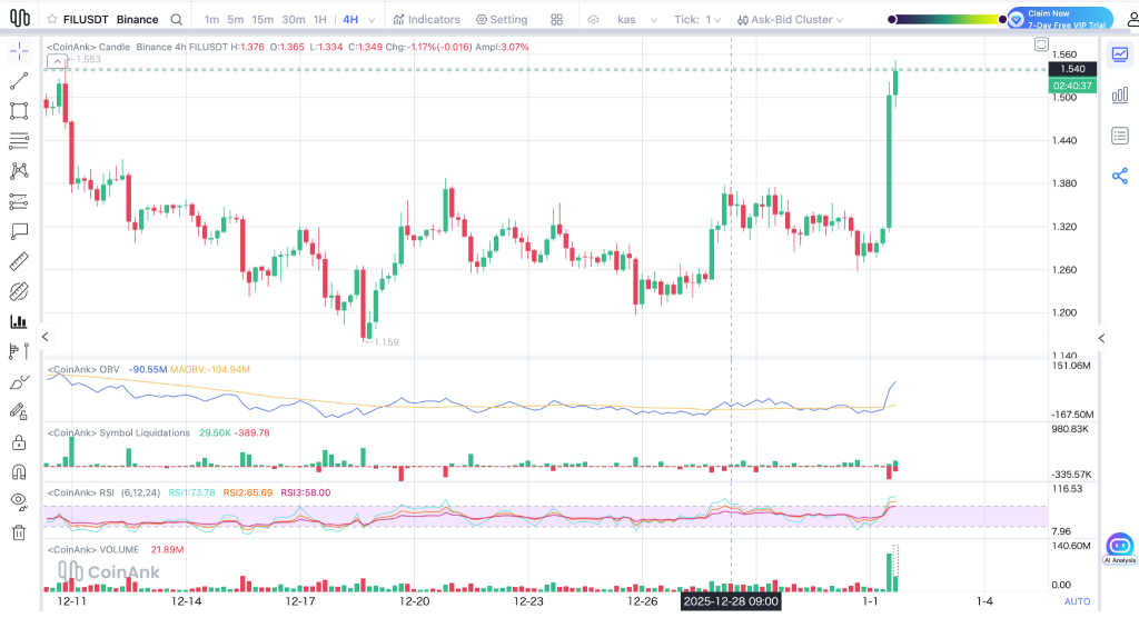 On the 4-hour chart, FIL spent most of December stuck between roughly $1.20 and $1.35. The FIL price tested that zone over and over, but sellers never managed to push it lower in a meaningful way. That kind of sideways action usually builds pressure, and eventually something has to give.