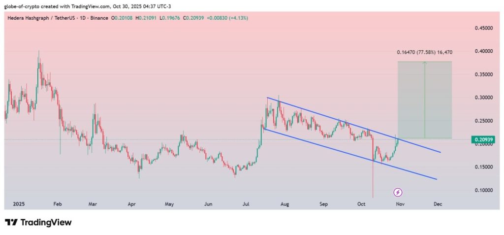 Globe of Crypto and CAI Soren are both pointing to the exact same technical setup. A big bullish flag has been forming on the daily chart, and HBAR is sitting right on the edge of it. The last time the price built this kind of structure, things escalated quickly.