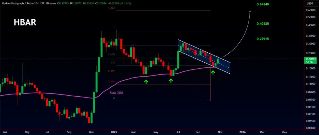 If HBAR pushes through that flag and we finally see liftoff, there are three key levels traders are watching: Around $0.27915. Then a push to $0.4023. And if things really heat up, $0.64240