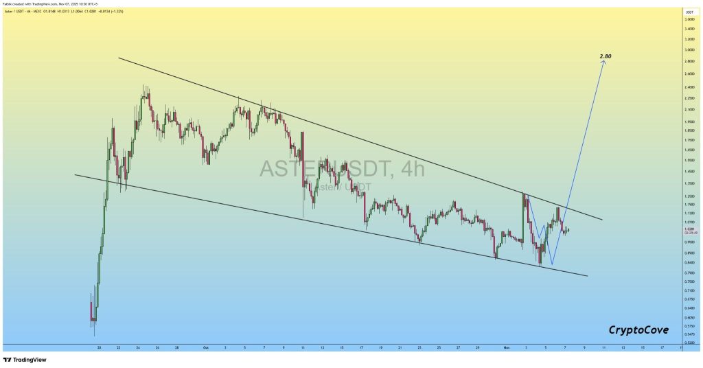 Technical analyst Crypto Faibik shared a chart showing the ASTER price forming a classic falling wedge pattern on the 4-hour timeframe. It’s the kind of setup that usually appears just before a breakout.