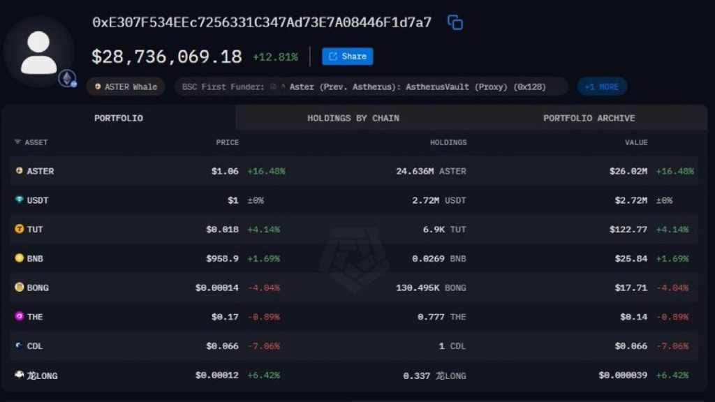 One address now holds over 24.6 million ASTER, worth roughly $26 million, and their overall portfolio is sitting above $28.7 million, up more than 12% in a single day.