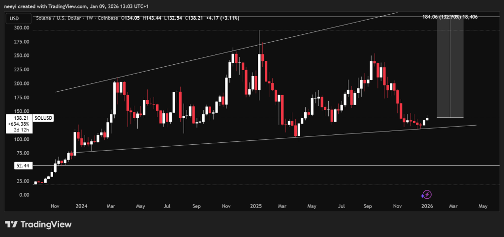 Each dip toward the lower boundary has produced higher lows. Each major rally has pushed price to higher highs. That pattern is exactly what keeps long-term Solana discussions alive as 2027 slowly comes into view.