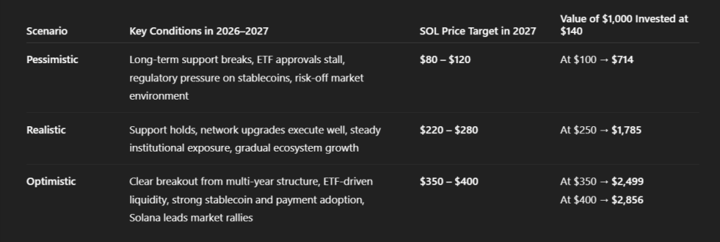In this scenario, Solana price reaching $350 to $400 in 2027 becomes a reflection of repricing rather than speculation. A $1,000 investment at $140 would grow to about $2,499 at $350 or roughly $2,856 at $400.