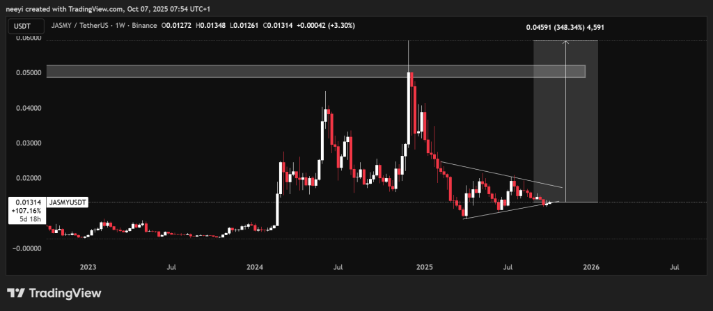 Looking at the chart, JasmyCoin price has been trading inside a triangle pattern for a while. It looks set to bounce toward the upper edge of that triangle, which could take the price to about $0.018 in the short term. That move alone would already be a healthy gain.
