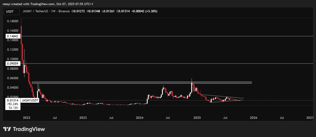 Technical charts show that the $0.04 to $0.05 zone is crucial for JasmyCoin price. It has rejected this range multiple times, making it a logical first target in a strong market recovery.