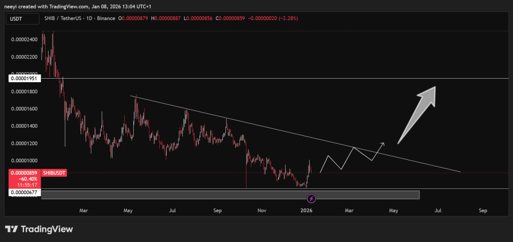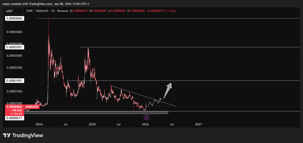 One possible scenario involves SHIB breaking above its descending trendline and entering a long consolidation phase. Price could rotate between $0.00000667 and $0.00001951 while momentum builds slowly.