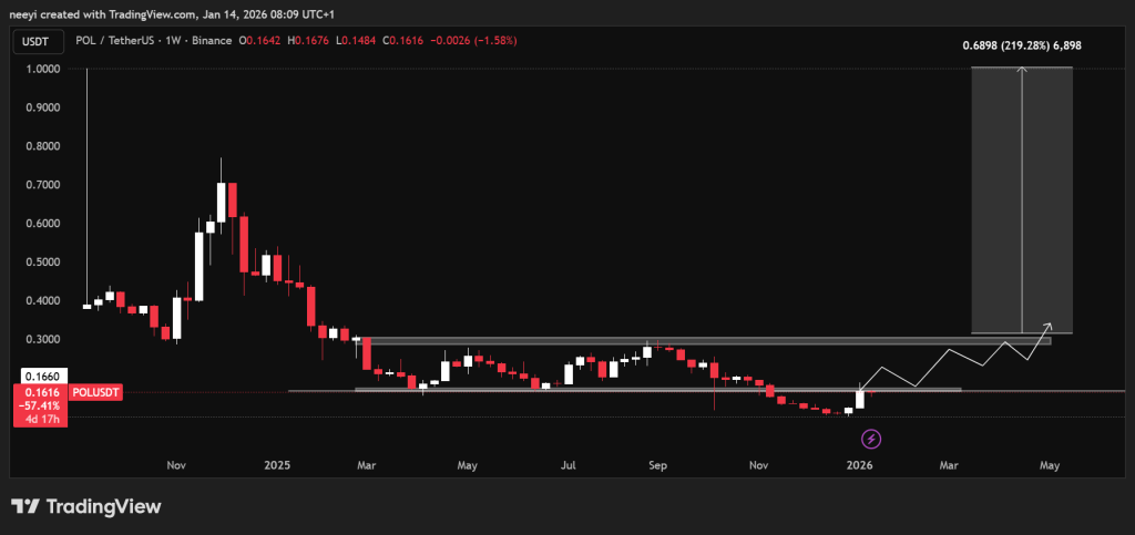 Polygon price has traded below the $0.3 resistance level since February 2025. Price slipped into that zone and failed to reclaim it for nearly a year, turning that level into a major psychological barrier. Conditions worsened in November 2025 when POL price dropped below support around $0.16.