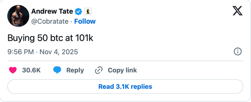 Last month, Andrew Tate, the controversial influencer, said Bitcoin would drop to $26,000, and traders prepared for a hit. But blockchain data told another tale: even as he warned of a bear market, his wallets bought more than $5 million in Bitcoin at discounted prices.
