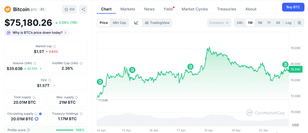 Bitcoin (BTC) Price at $75,180 as Institutional Inflows Stay Strong