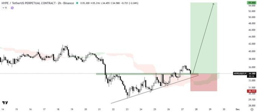 The Crypto Express notes that the HYPE price is getting solid backing from the Ichimoku Cloud, which is acting like a cushion underneath the price.