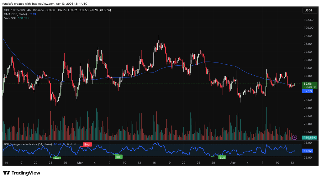We had a look at the 4-hour chart, and the short term structure is neutral but showing early signs of life. The SOL price is trading at $82.56, up 0.86% on the session, with a high of $82.79 and a low of $81.82.