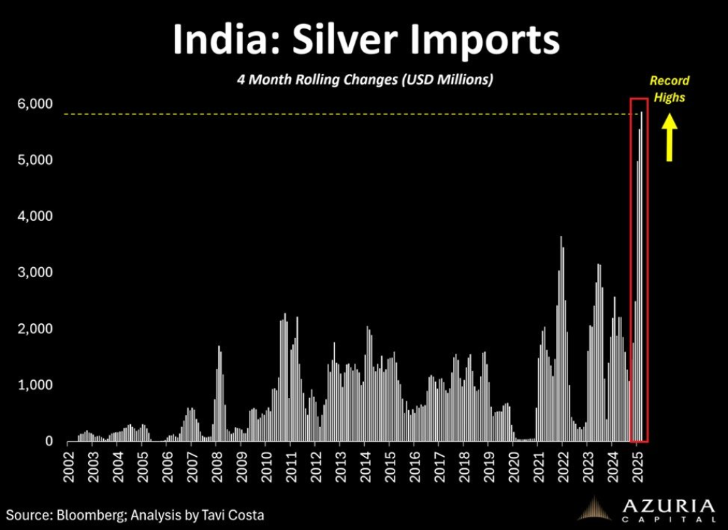 Over the last four months, India’s silver imports surged to a record $5.9 billion, marking one of the most aggressive accumulation phases in the country’s history. That figure means an incredible 400% increase since Q4 2024 and now sits 64% above the previous peak recorded in 2022.