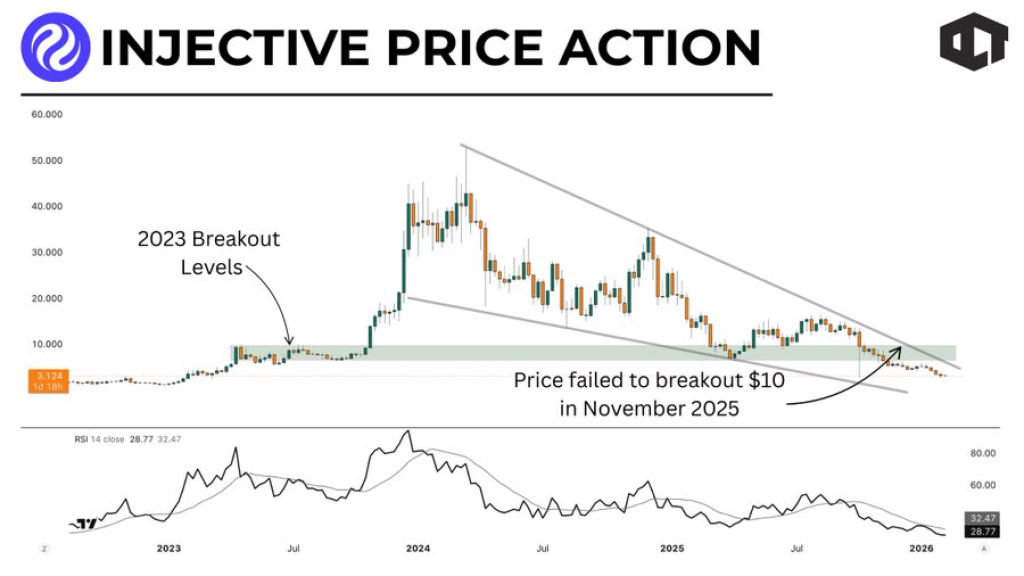 Our Crypto Talk highlights how INJ price rose vertically during the expansion phase. Rapid appreciation can persist only when supported by sustained usage and durable liquidity. Injective struggled to demonstrate capital retention at the same pace as valuation growth.