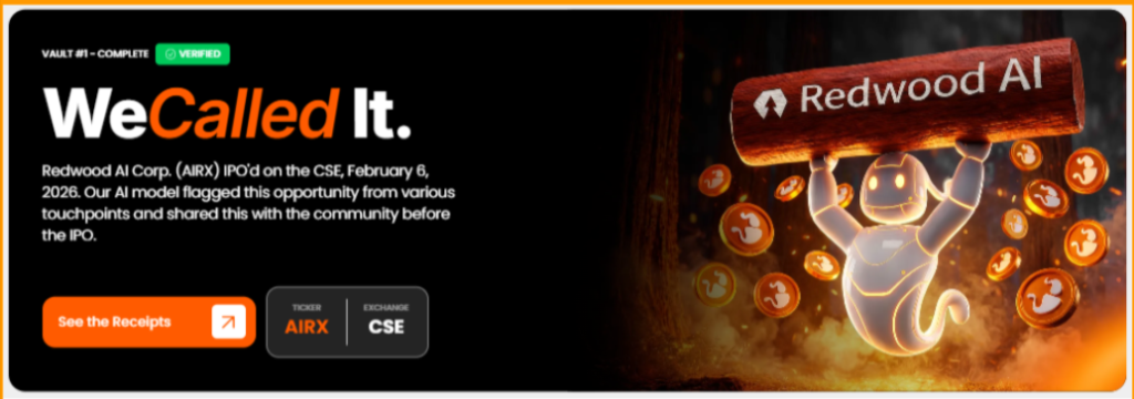 The platform also publicly flagged Redwood AI Corp. (CSE: AIRX) before its February 2026 CSE listing, giving token holders a visible proof point tied to the platform’s research thesis rather than a purely theoretical roadmap $ second proof is on the way. Entry starts at $10.