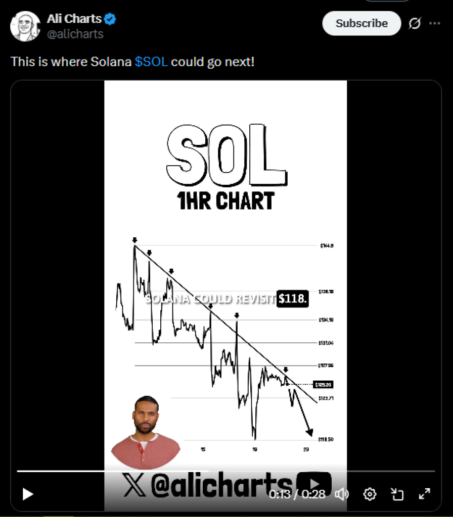 Analyst Ali Martinez also notes that Solana has been rejected multiple times by a resistance trendline in place since October. And another failure could drag the price back toward $118. But the analyst thinks there is some home. According to Ali, only a clean break above $128 would reopen the path to $135.