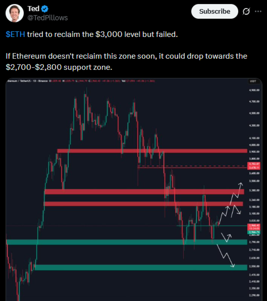 Market analysts aren’t quite bullish on the altcoin king either. According to analyst TedPillows, Ethereum’s rejection at $3,000 puts the $2,700–$2,800 zone back in sight if buyers don’t step in soon.