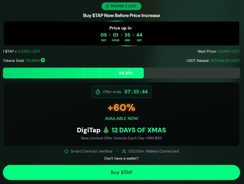 10x altcoins rarely look obvious before a price explosion. They show strength when the market is weak. Digitap’s omnibanking model, live app, and cross-border utility give it a path to mass adoption that most tokens simply don’t have. And that’s why many consider $TAP the best crypto to buy this Christmas season.