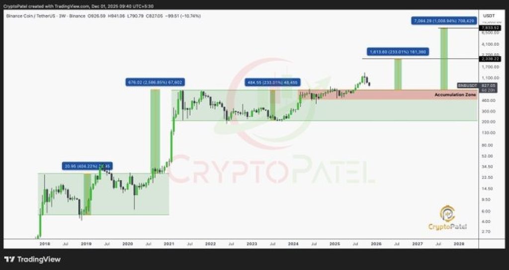 Patel’s chart shows that Binance Coin has been respecting its breakout structure for months. Each phase of consolidation has been followed by a clean expansion, which is the same pattern that produced BNB’s large cycle runs in past years.